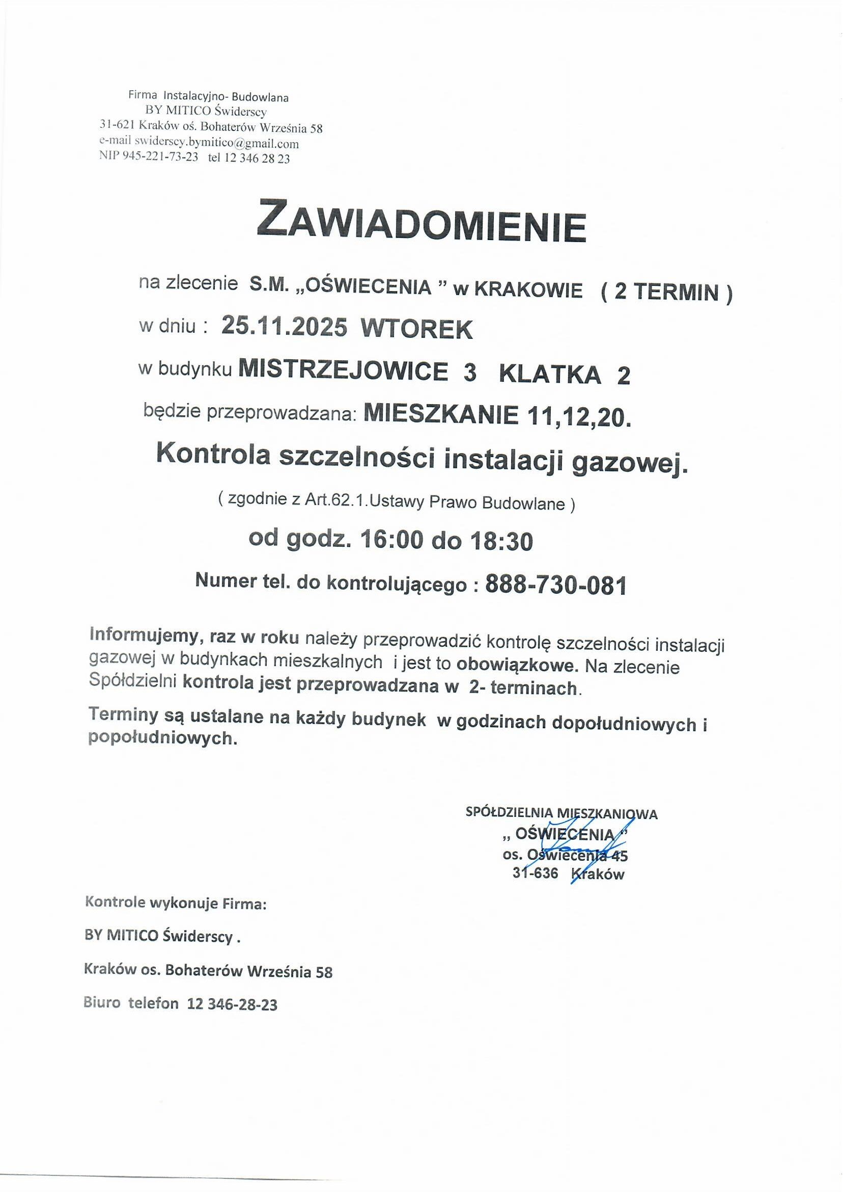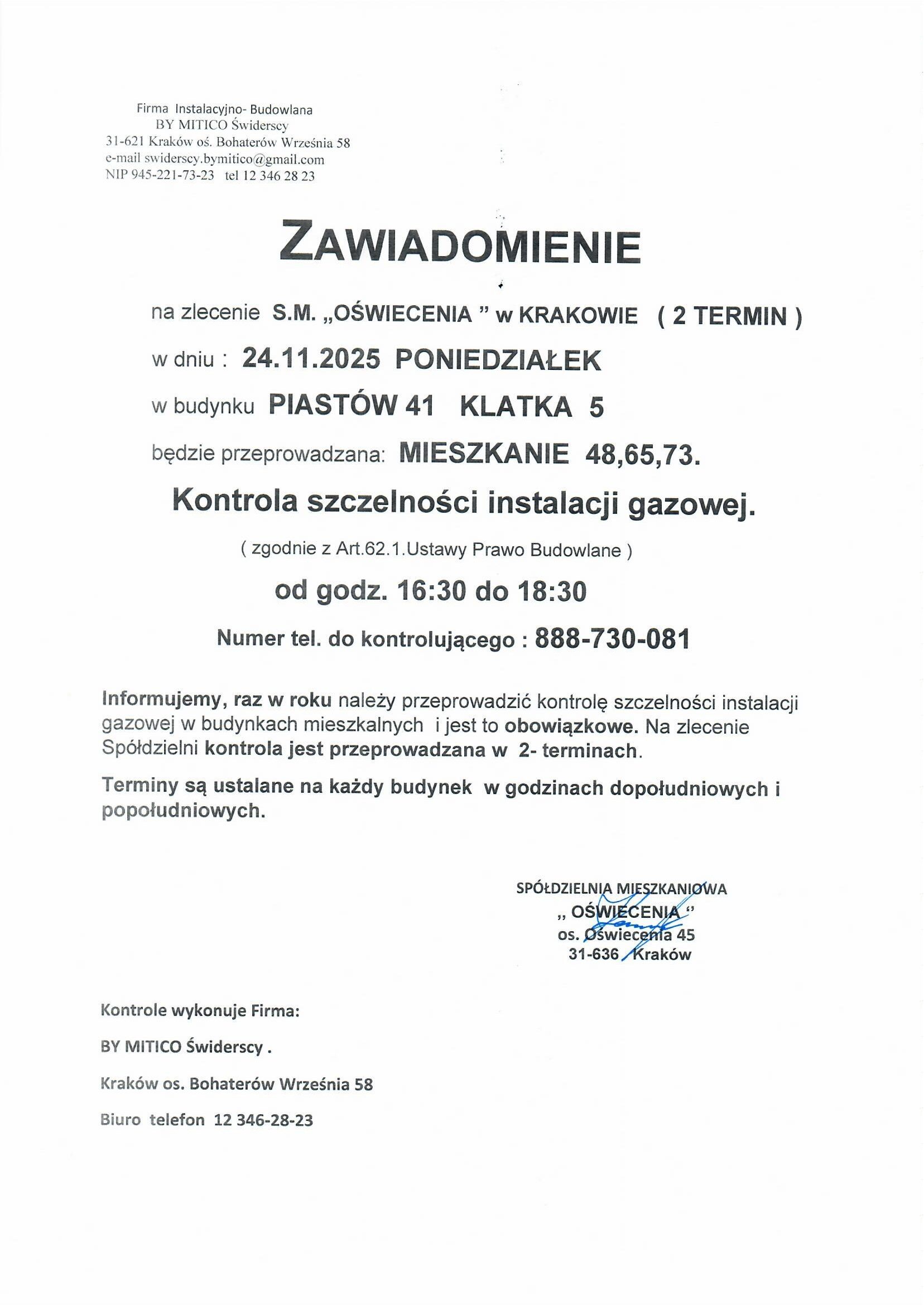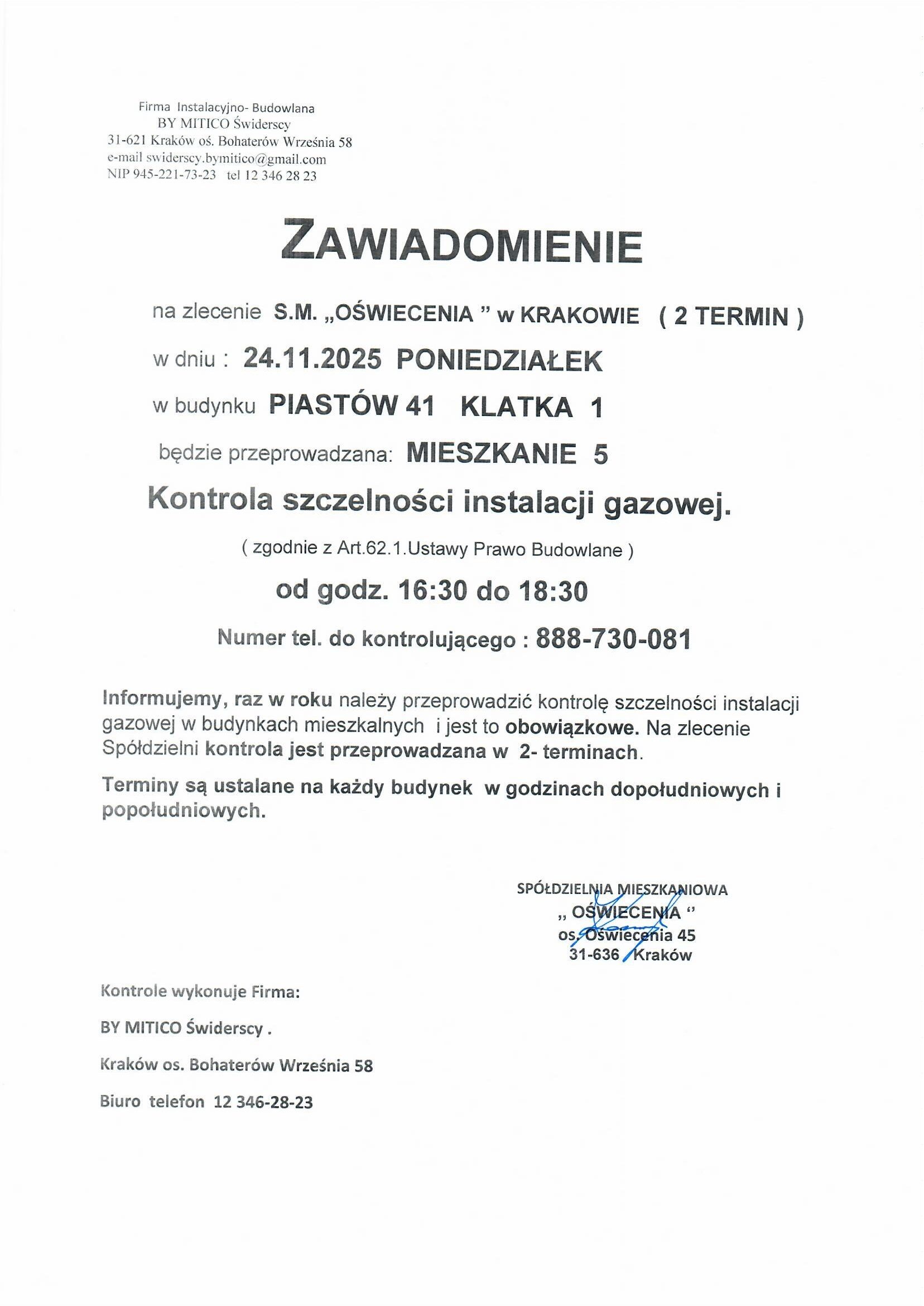 Kontrola szczelności instalacji gazowej w budynku os. Mistrzejowice 3, 10, 13 oraz os. Piastów 41 – 2 termin