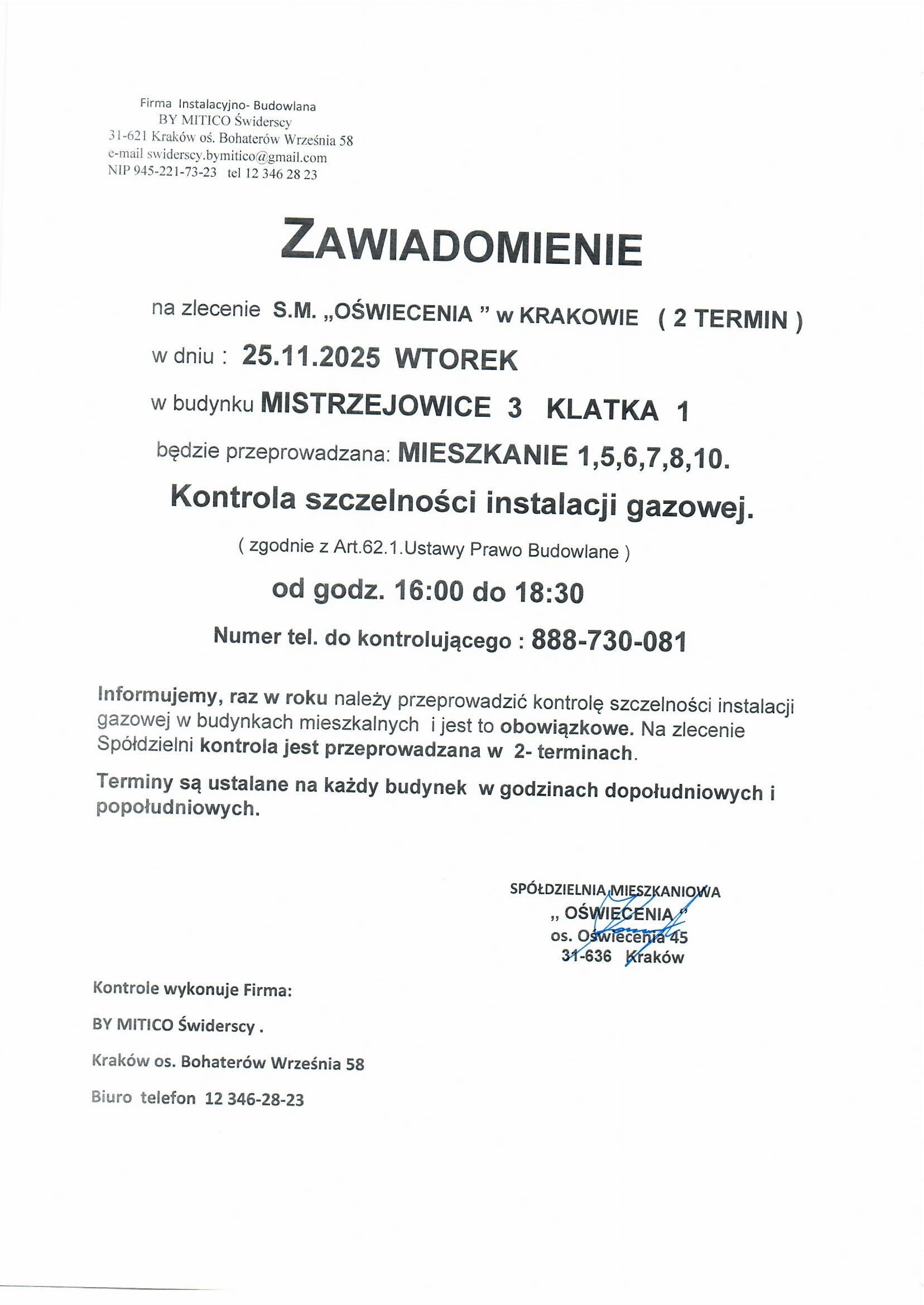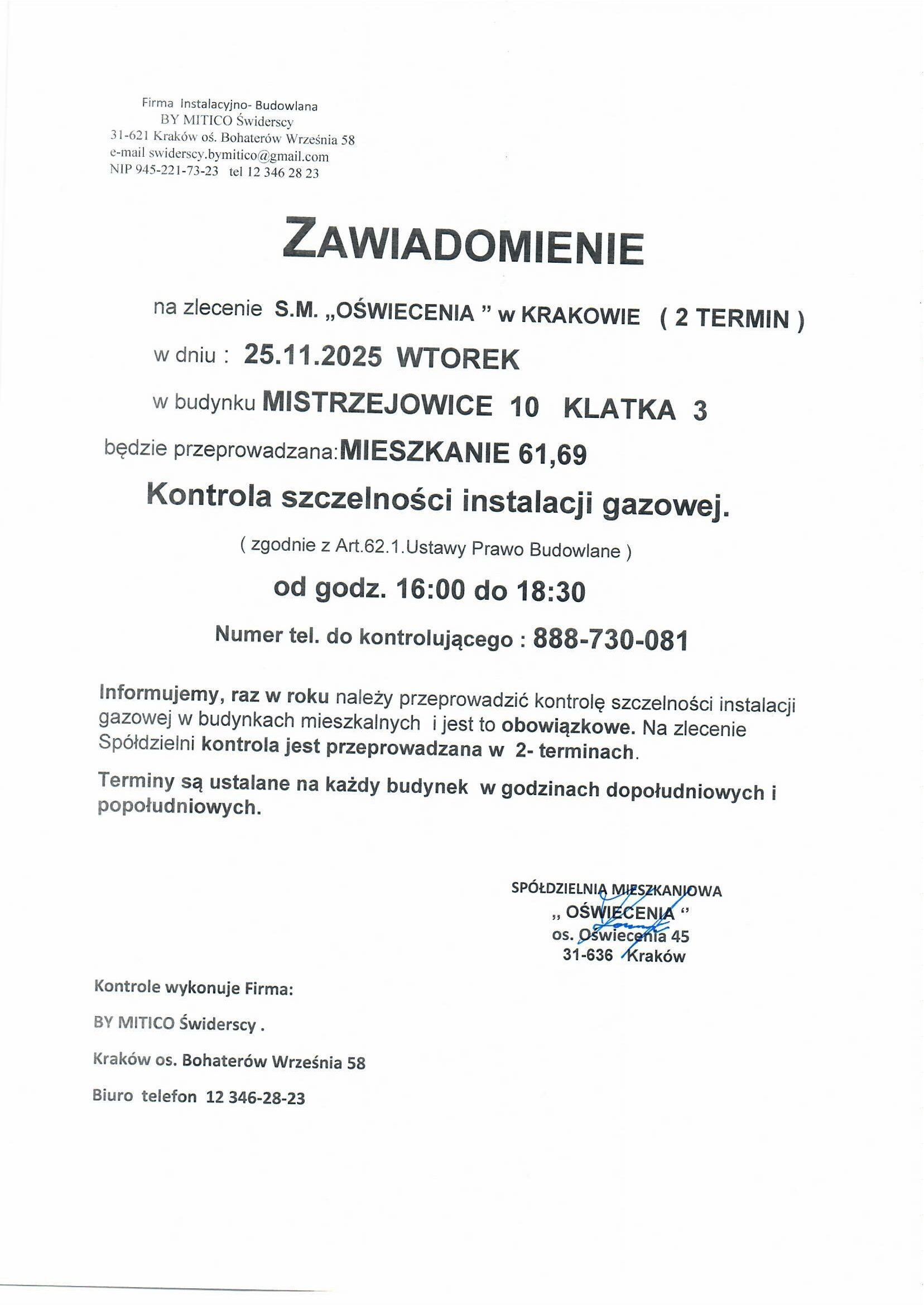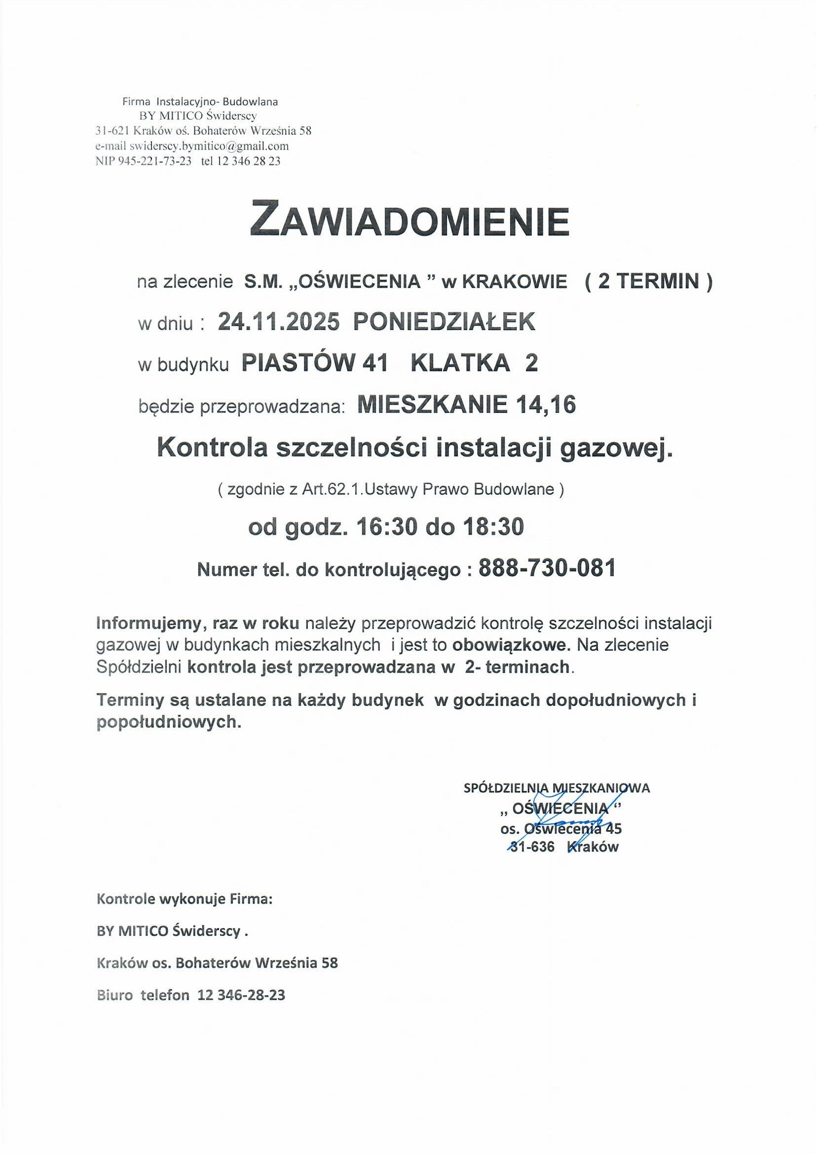 Kontrola szczelności instalacji gazowej w budynku os. Mistrzejowice 3, 10, 13 oraz os. Piastów 41 – 2 termin