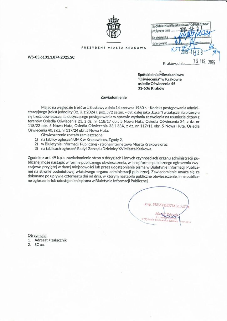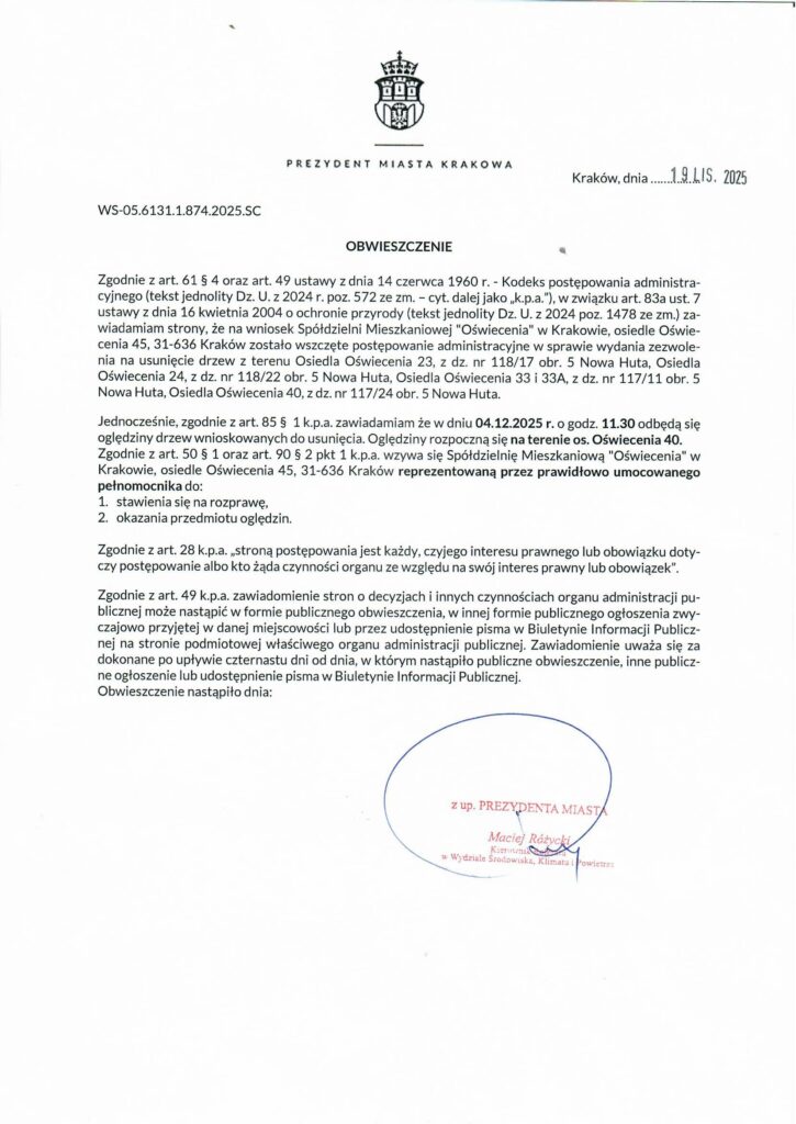 Spółdzielnia Mieszkaniowa „Oświecenia” informuje, że 4 grudnia 2025 r. o godz. 11.30 odbędą się oględziny drzew wskazanych we wniosku o ich usunięcie: os. Oświecenia 23, 24, 33, 33A, 40.
