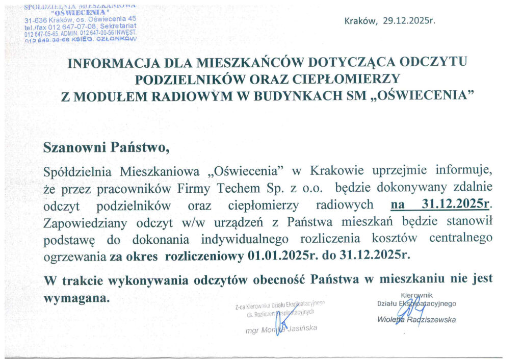 Spółdzielnia Mieszkaniowa „Oświecenia” w Krakowie uprzejmie informuje, że przez pracowników Firmy Techem Sp. z o.o. będzie dokonywany zdalnie odczyt podzielników oraz ciepłomierzy radiowych na 31.12.2025r.