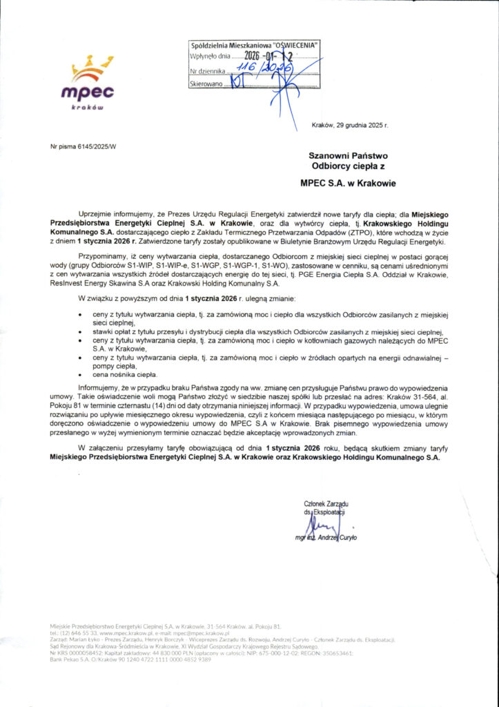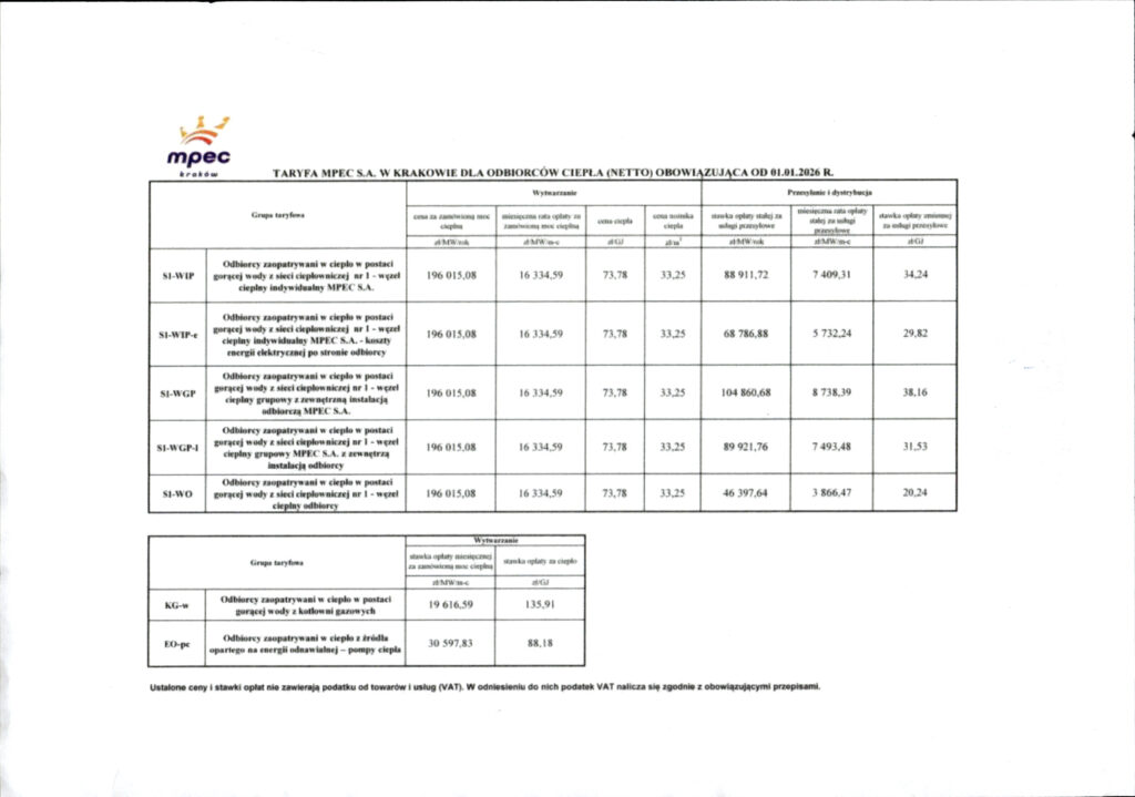 informujemy, że od 1 stycznia 2026 r. obowiązują nowe stawki za ciepło, zgodnie z taryfą Miejskiego Przedsiębiorstwa Energetyki Cieplnej S.A. w Krakowie.