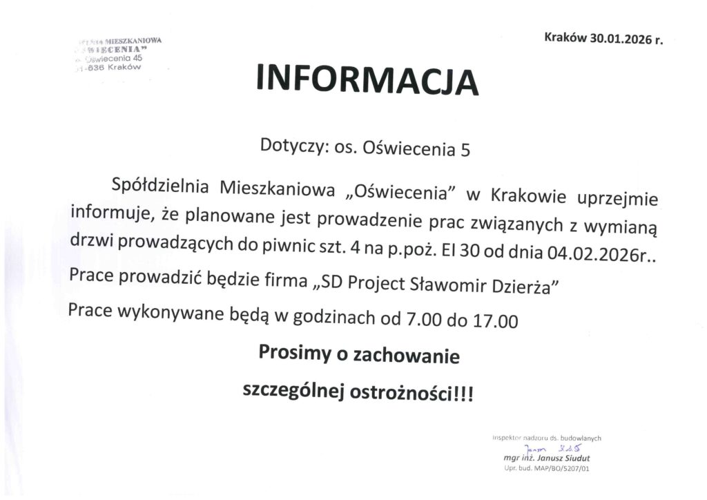 Spółdzielnia Mieszkaniowa „Oświecenia” w Krakowie uprzejmie informuje, że planowane jest prowadzenie prac związanych z wymianą drzwi prowadzących do piwnic (szt. 4) na przeciwpożarowe El 30 od dnia 04.02.2026 r.