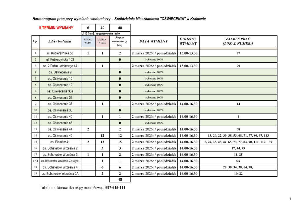 Harmonogram prac przy wymianie wodomierzy – 2 termin