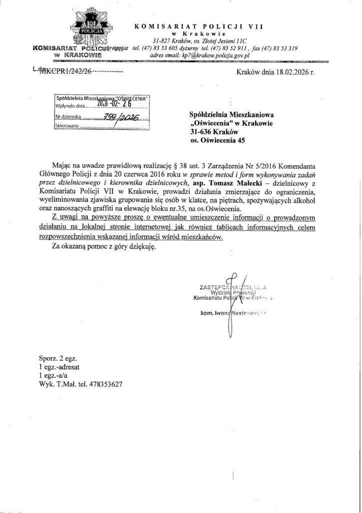 Dzielnicowy z Komisariatu Policji VII w Krakowie prowadzi wzmożone działania mające na celu ograniczenie i wyeliminowanie uciążliwych zachowań mieszkańców w rejonie bloków nr 21 i 35 na os. Oświecenia.