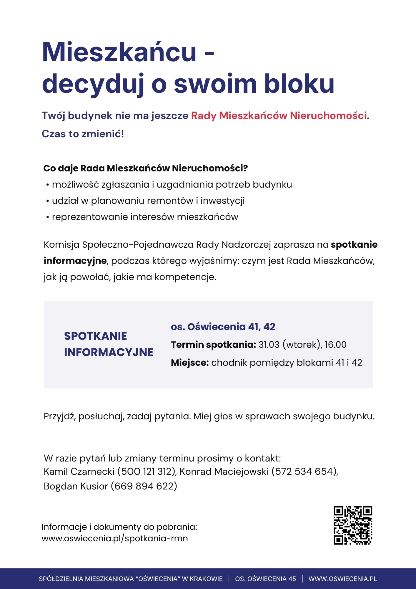 Zapraszamy mieszkańców budynków os. Oświecenia 41 i 42 na spotkanie informacyjne z Komisją Społeczno-Pojednawczą Rady Nadzorczej, dotyczące Rady Mieszkańców Nieruchomości.