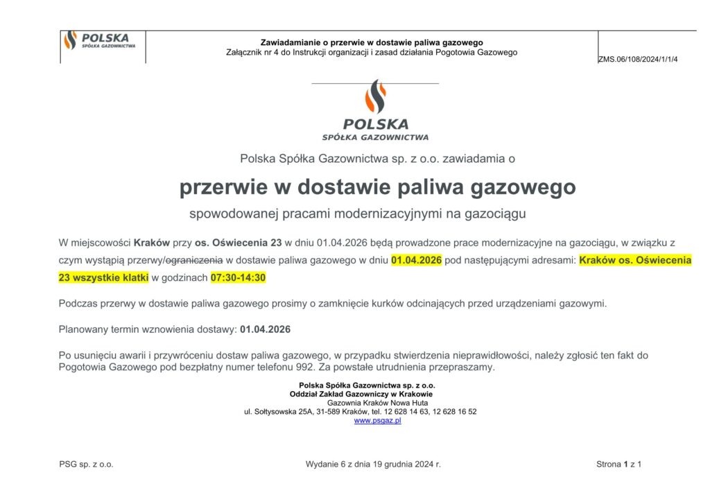 Polska Spółka Gazownictwa sp. z o.o. zawiadamia o przerwie w dostawie paliwa gazowego spowodowanej pracami modernizacyjnymi na gazociągu w bloku nr 23 na os. Oświecenia.