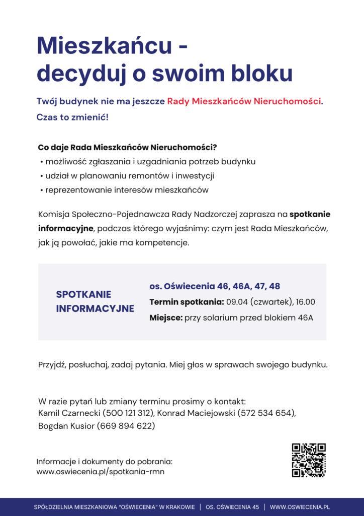 Zapraszamy mieszkańców budynków os. Oświecenia 46, 46A, 47 i 48 na spotkanie informacyjne z Komisją Społeczno-Pojednawczą Rady Nadzorczej, dotyczące Rady Mieszkańców Nieruchomości.