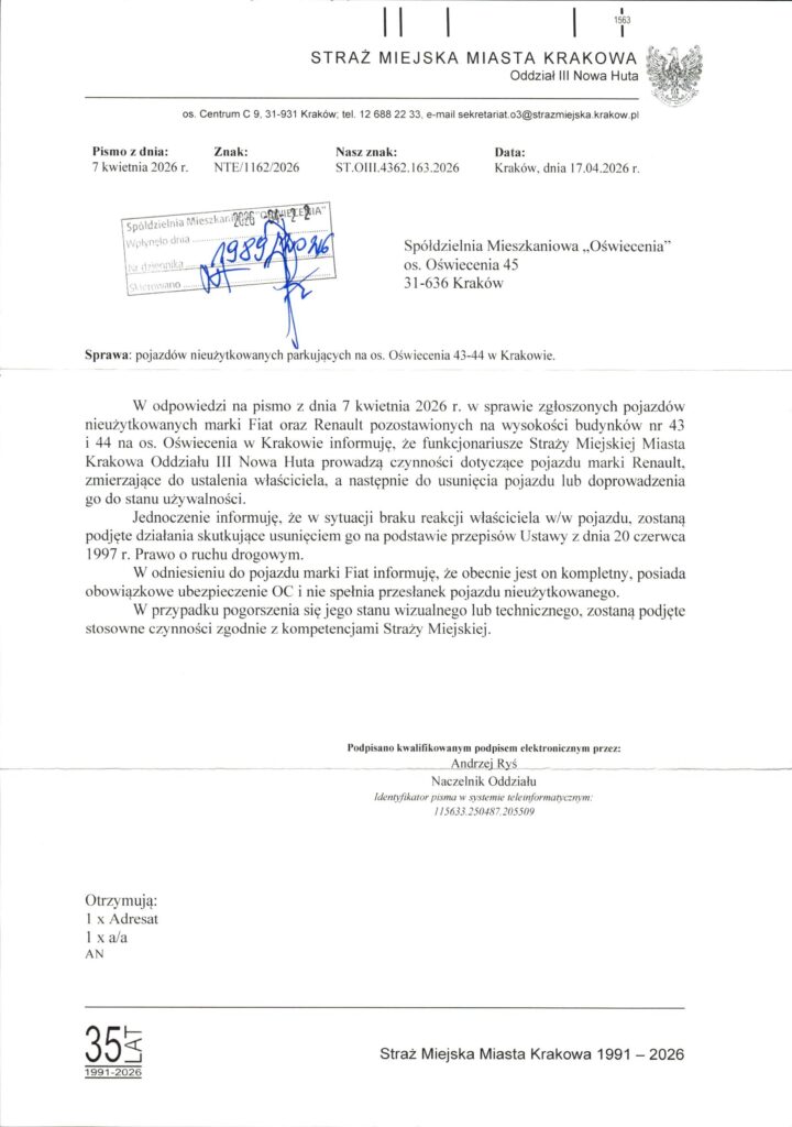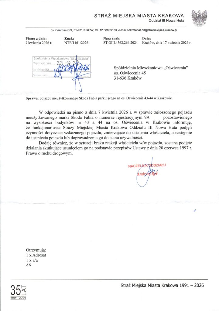 Straż Miejska Miasta Krakowa poinformowała o podjęciu czynności w sprawie pojazdów pozostawionych na os. Oświecenia (w rejonie budynków 43–44).
